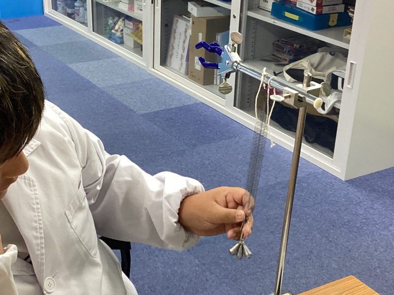 ばねを静止させて、長さを測ろうとする表情が真剣ですね。