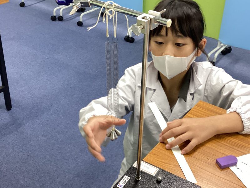 高学年クラスでは、ばねの「のび」を調べる実験をしました。
