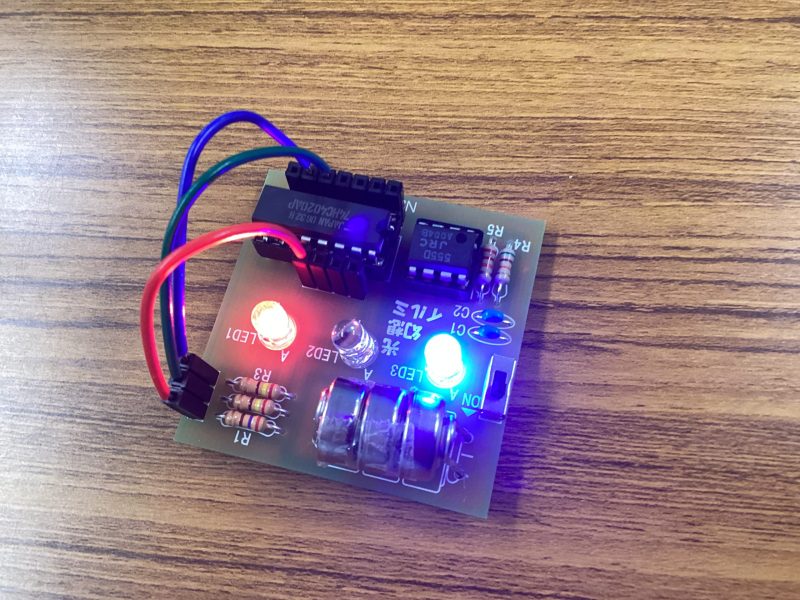 赤・緑・青のLEDは、写真のICにつけてあるソケットのどこに線をつなぐかで、
