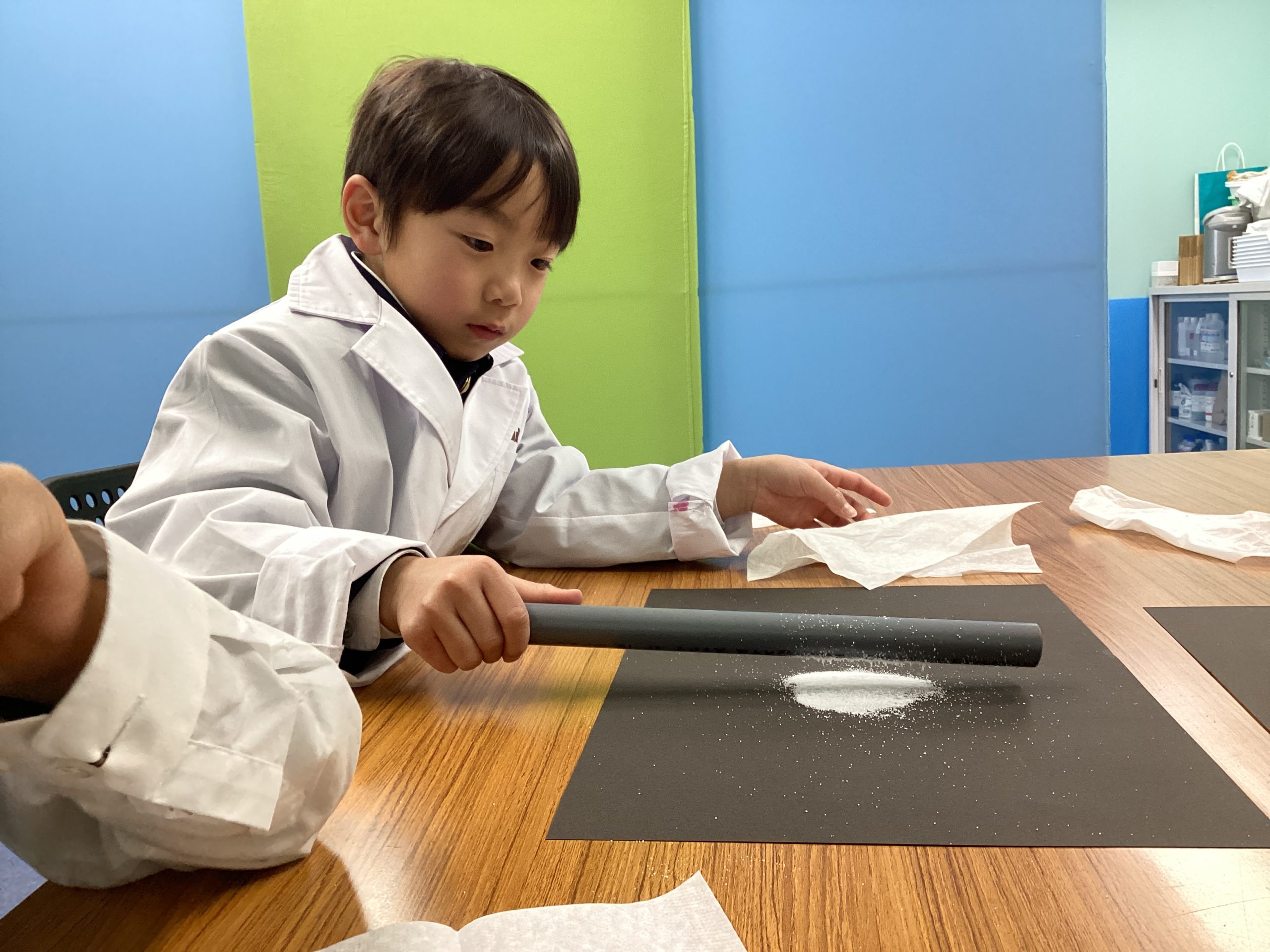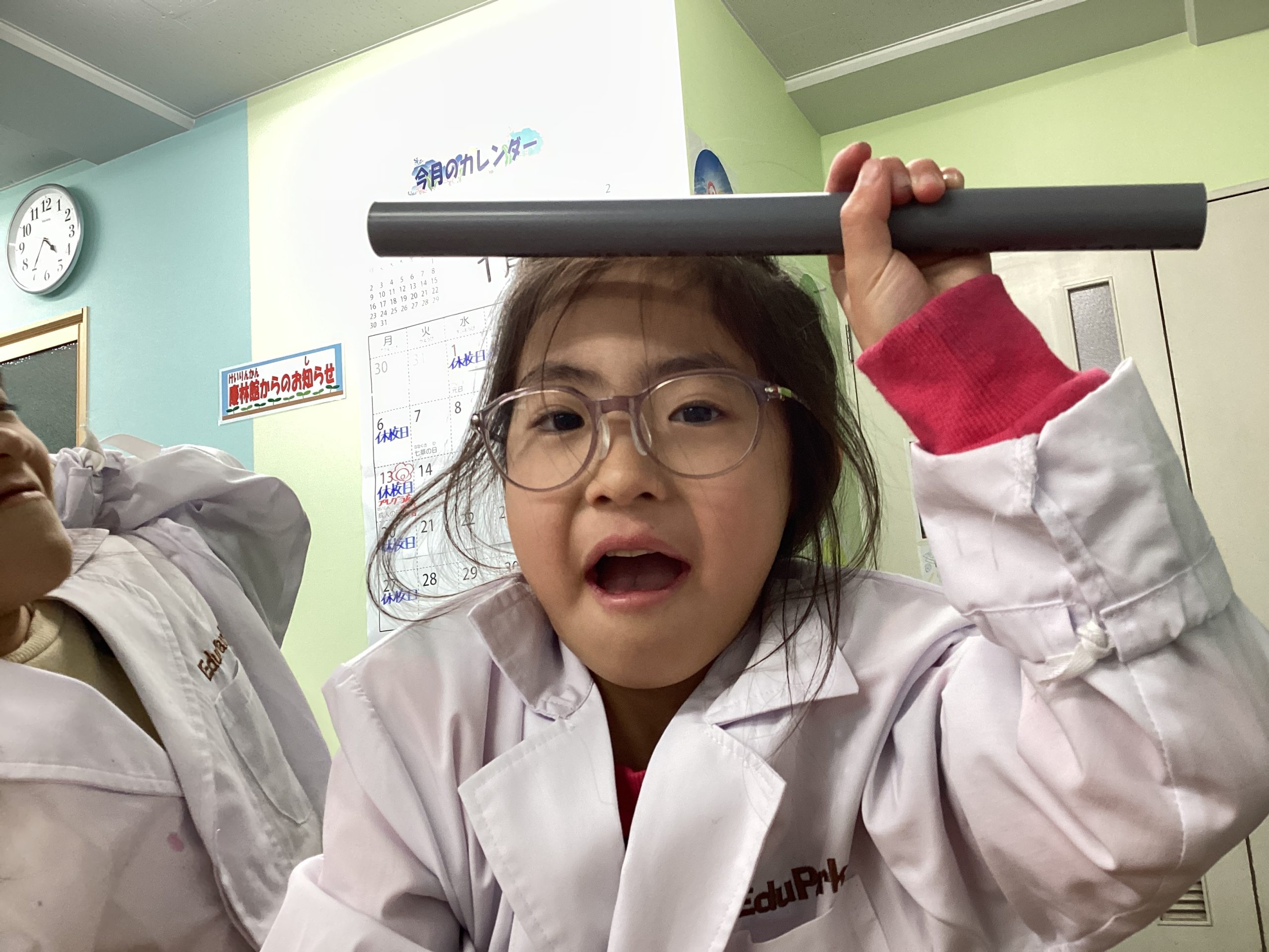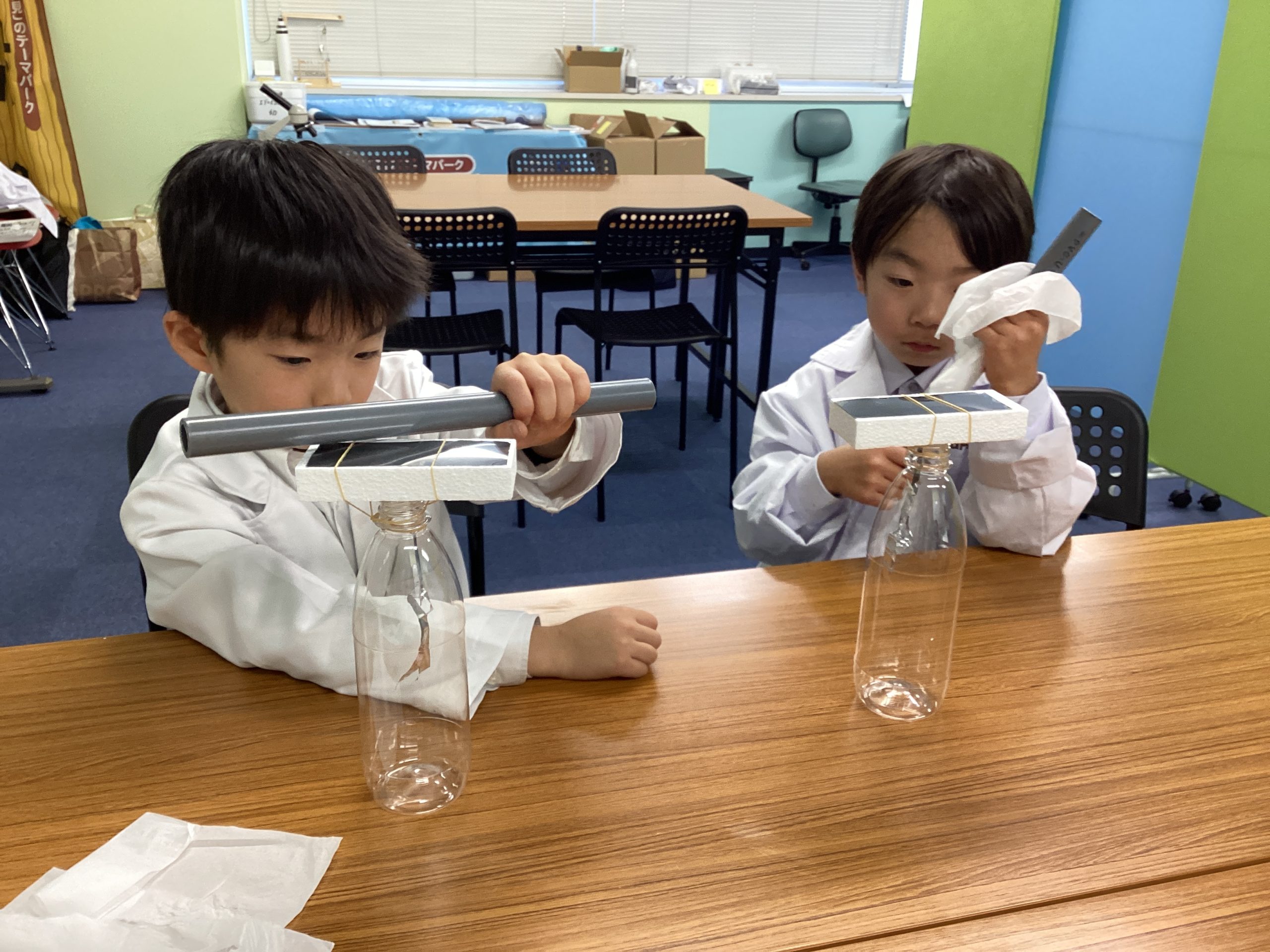 塩化ビニルパイプを使って静電気が発生したか確認中。