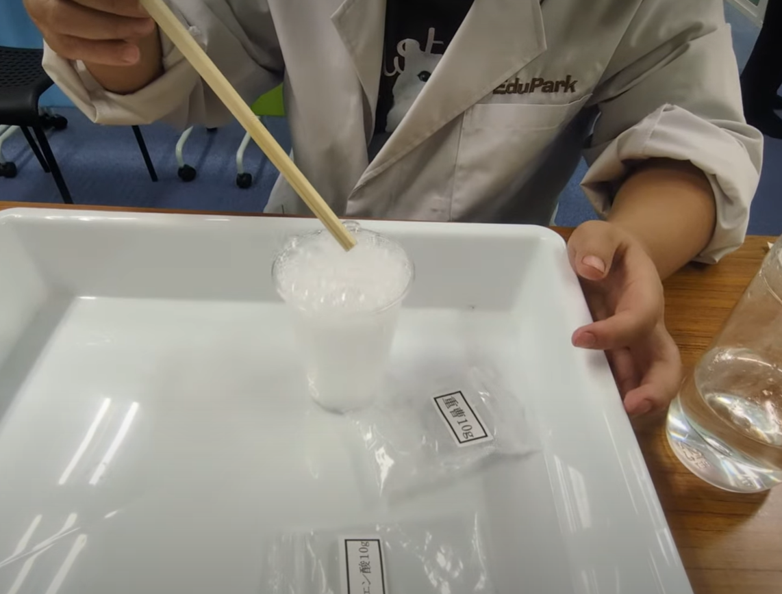 クエン酸と重曹を使って二酸化炭素を発生させました。