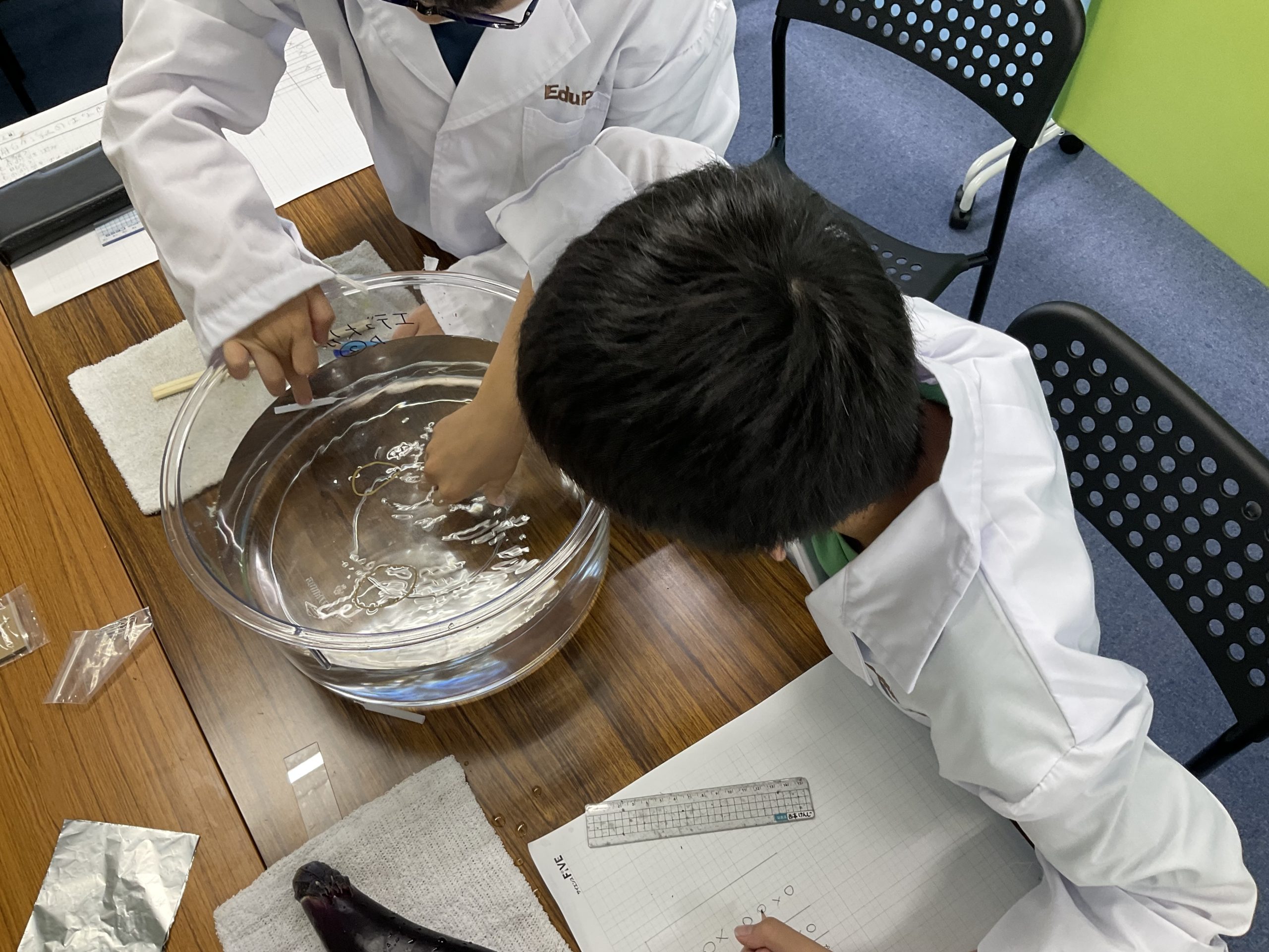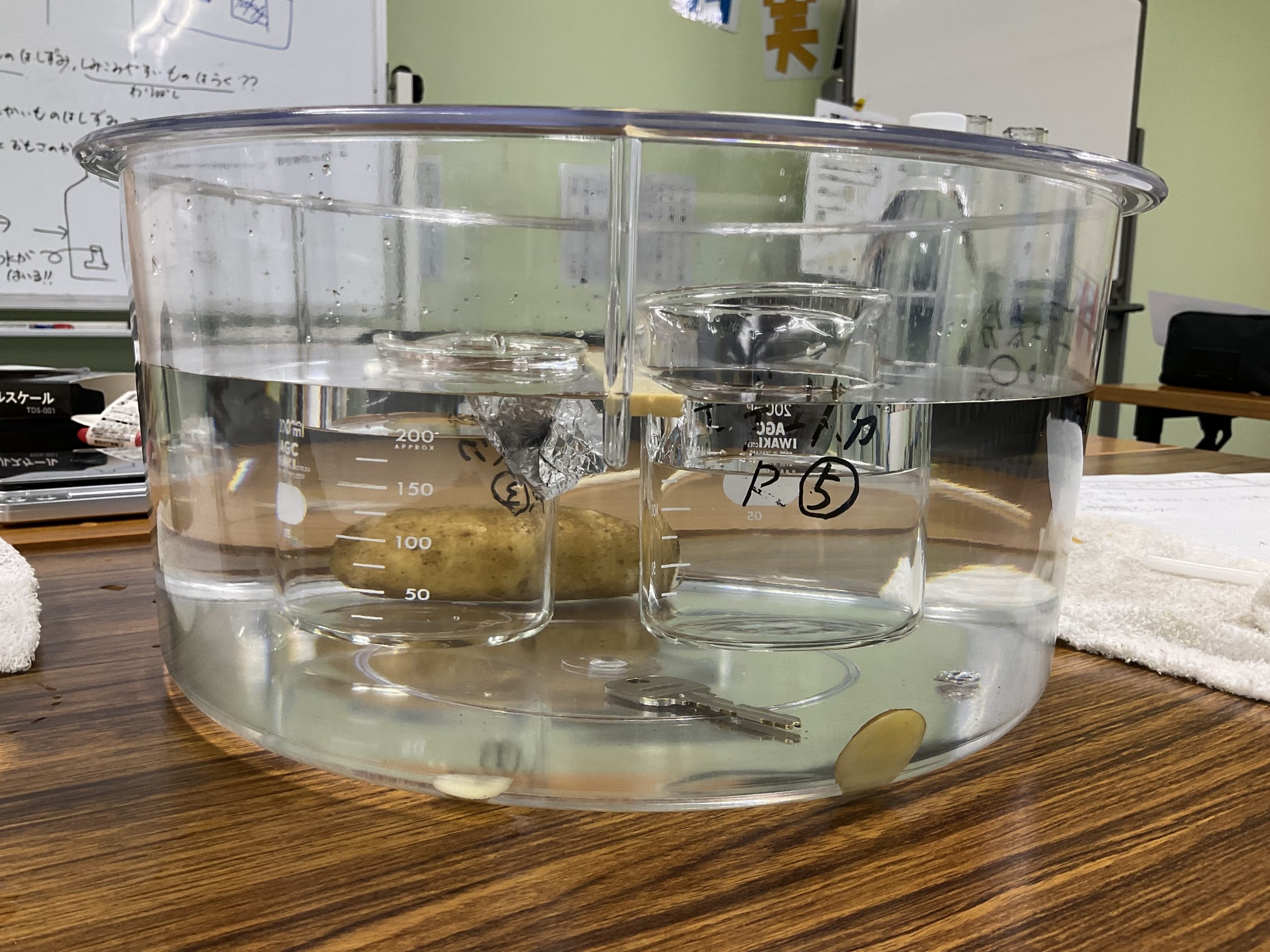 ビー玉や家の鍵(金属製)が沈み、割り箸やナスが浮いたことから