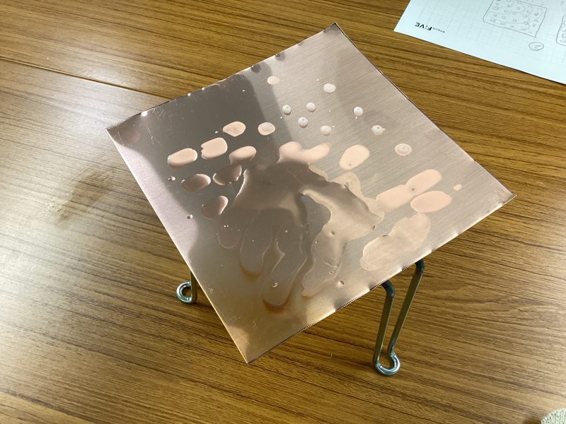 銅板にあらかじめ、ロウソクのロウを点々とたらしておき、