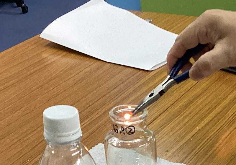 前回実験で行った「水上置換法」で、まず酸素を集めました。