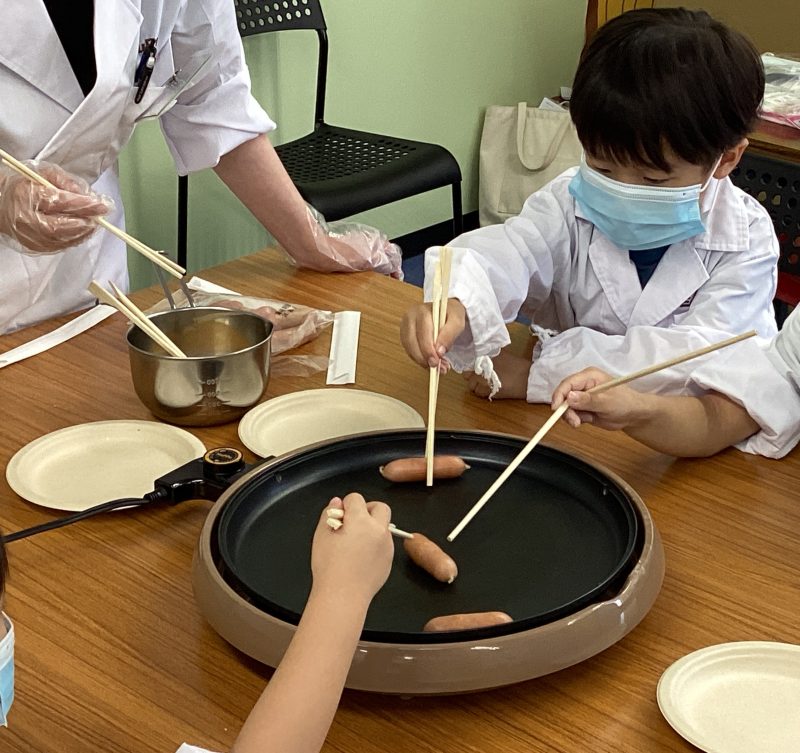 ホットプレートでウインナーとスクランブルエッグを焼いてもらいました。