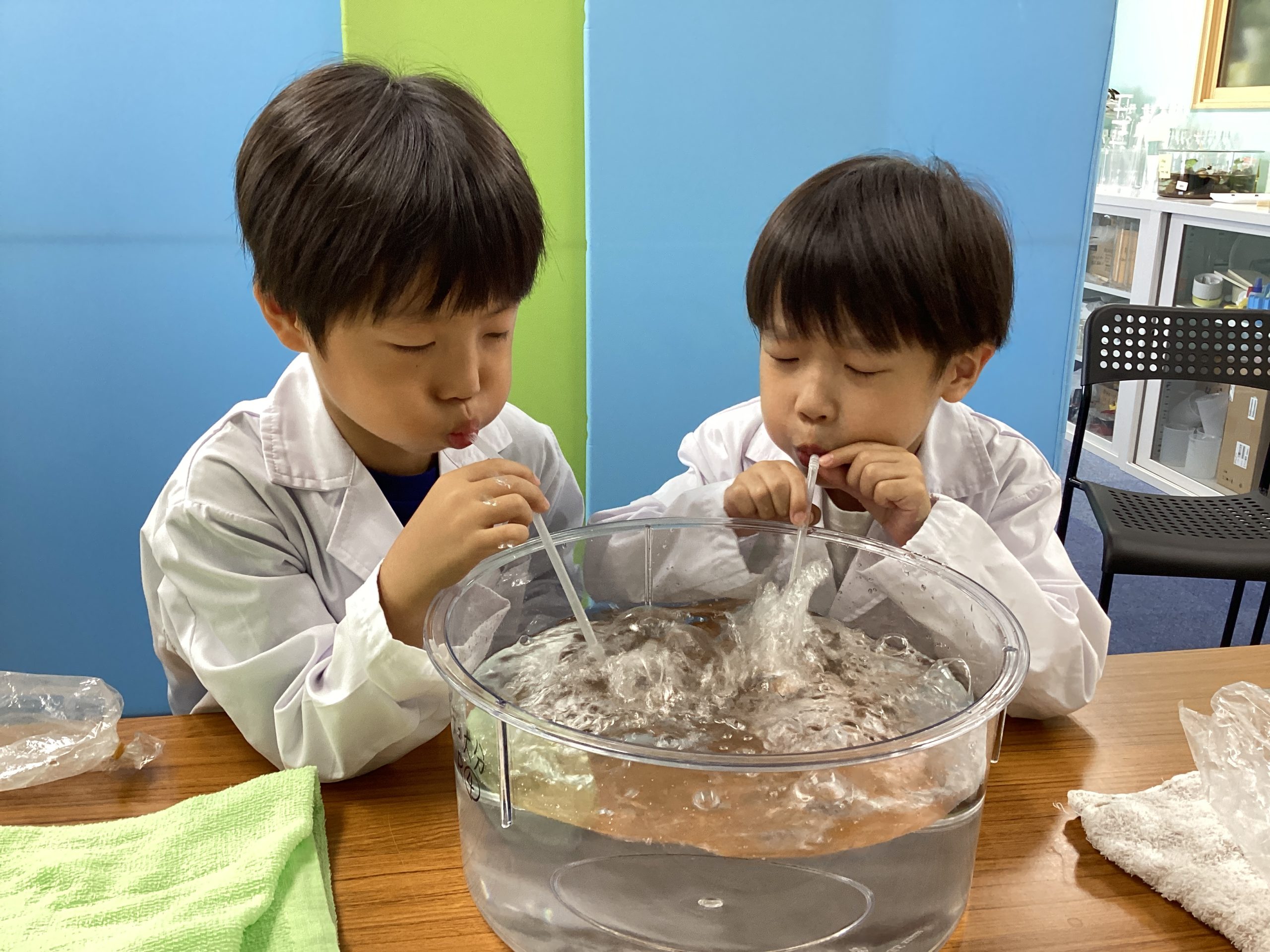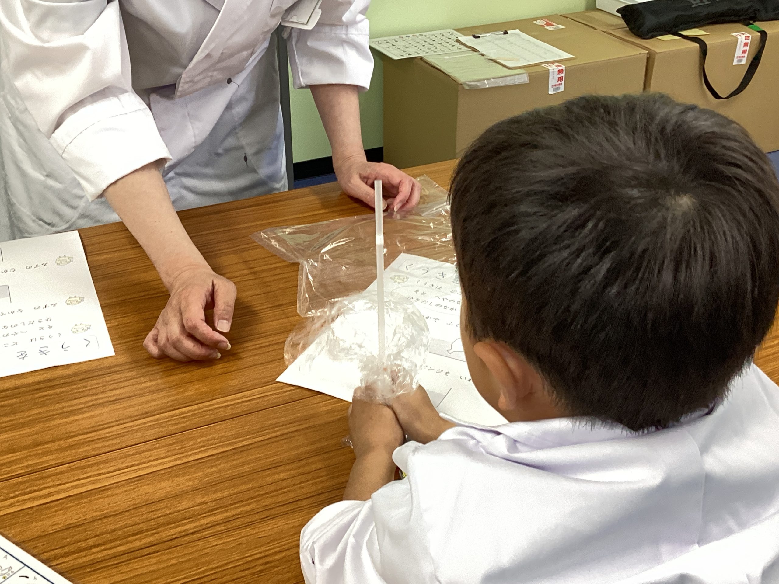 それを確かめてもらうために、袋の口にストローをさして袋を押してもらいました。