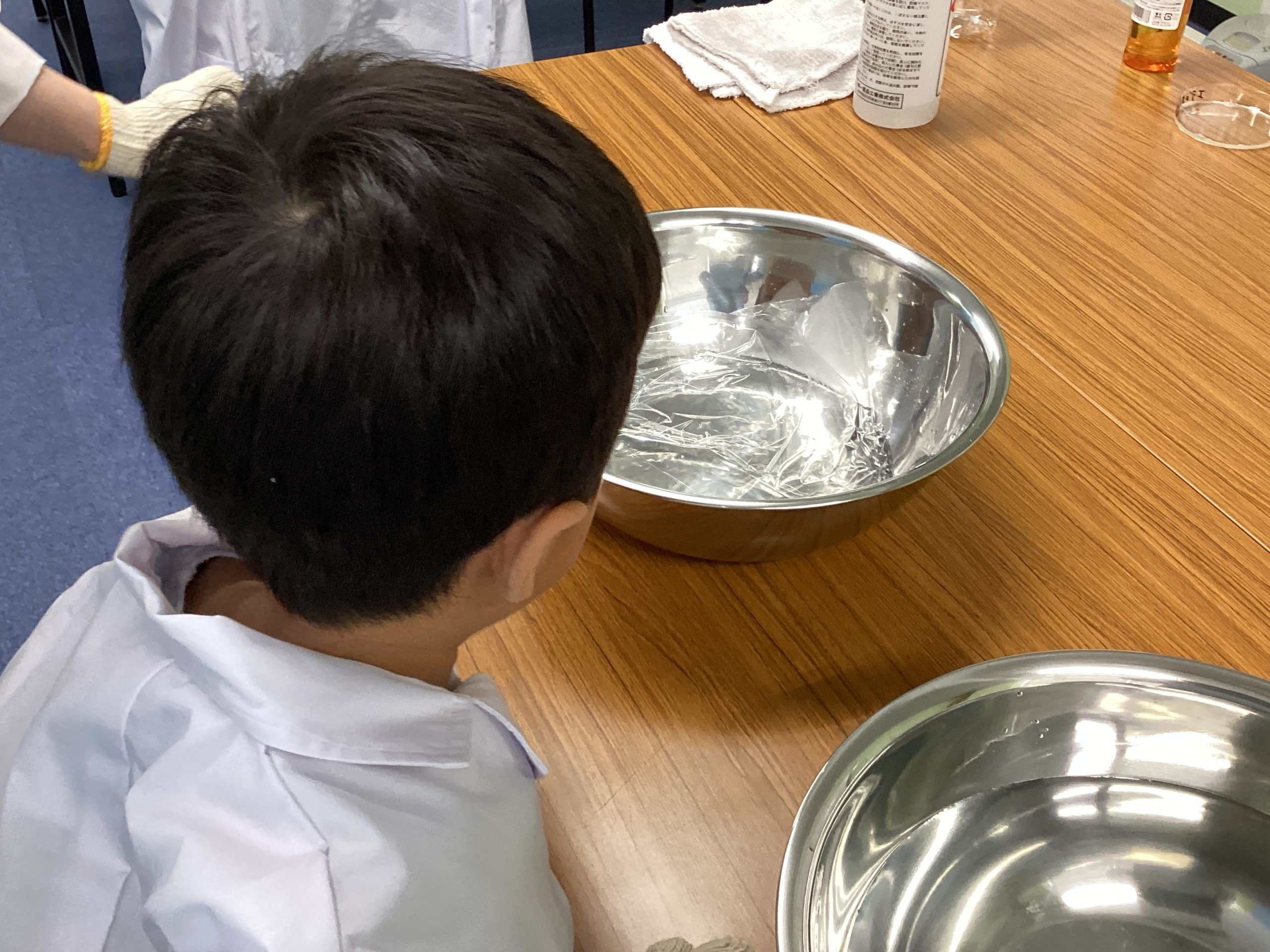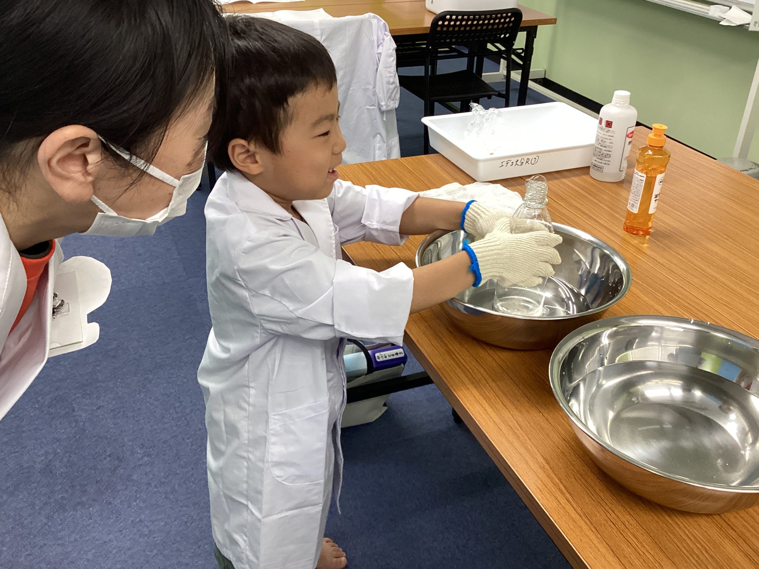 つぎは、洗剤とペットボトルを使って実験を行いました。