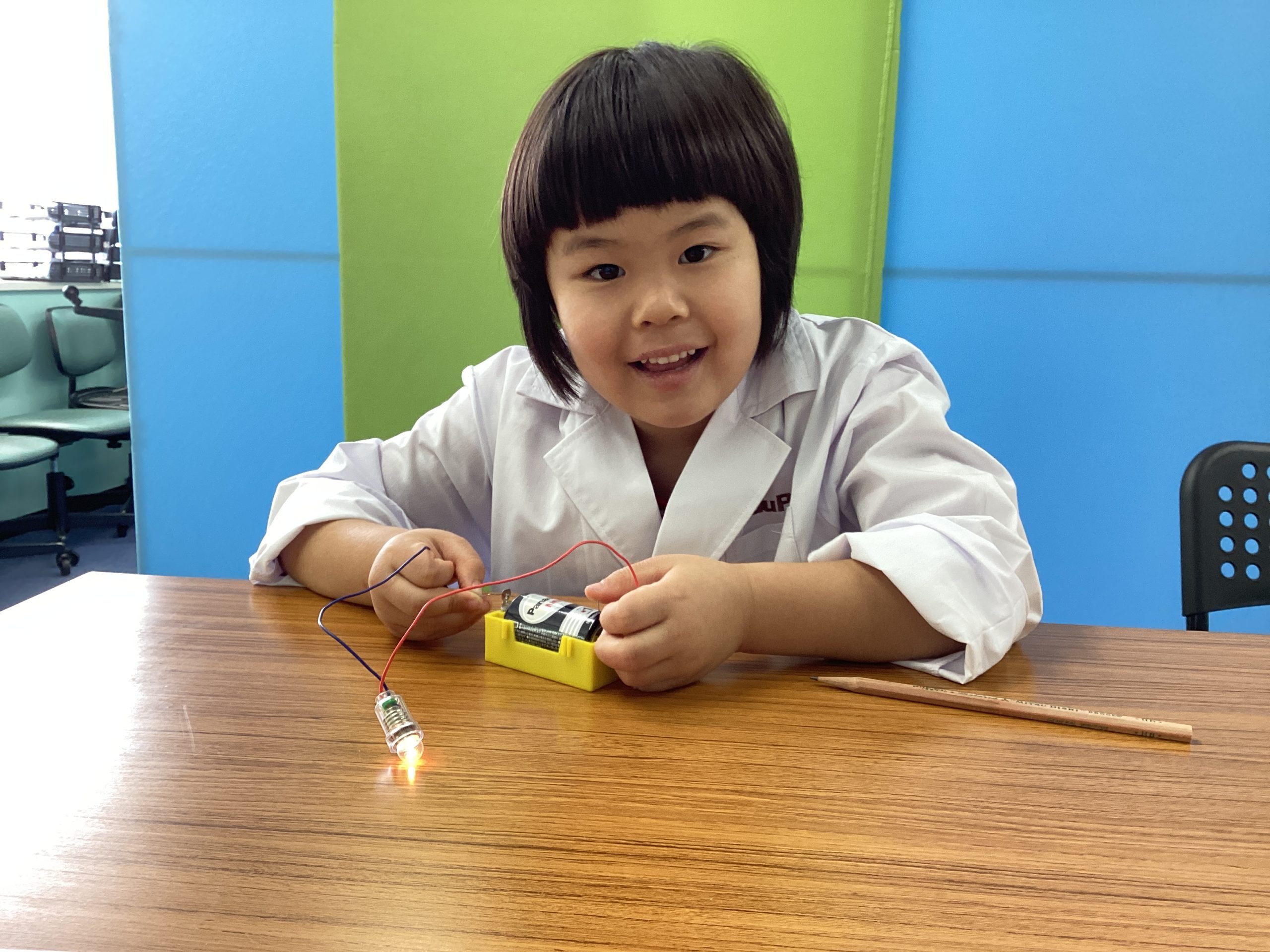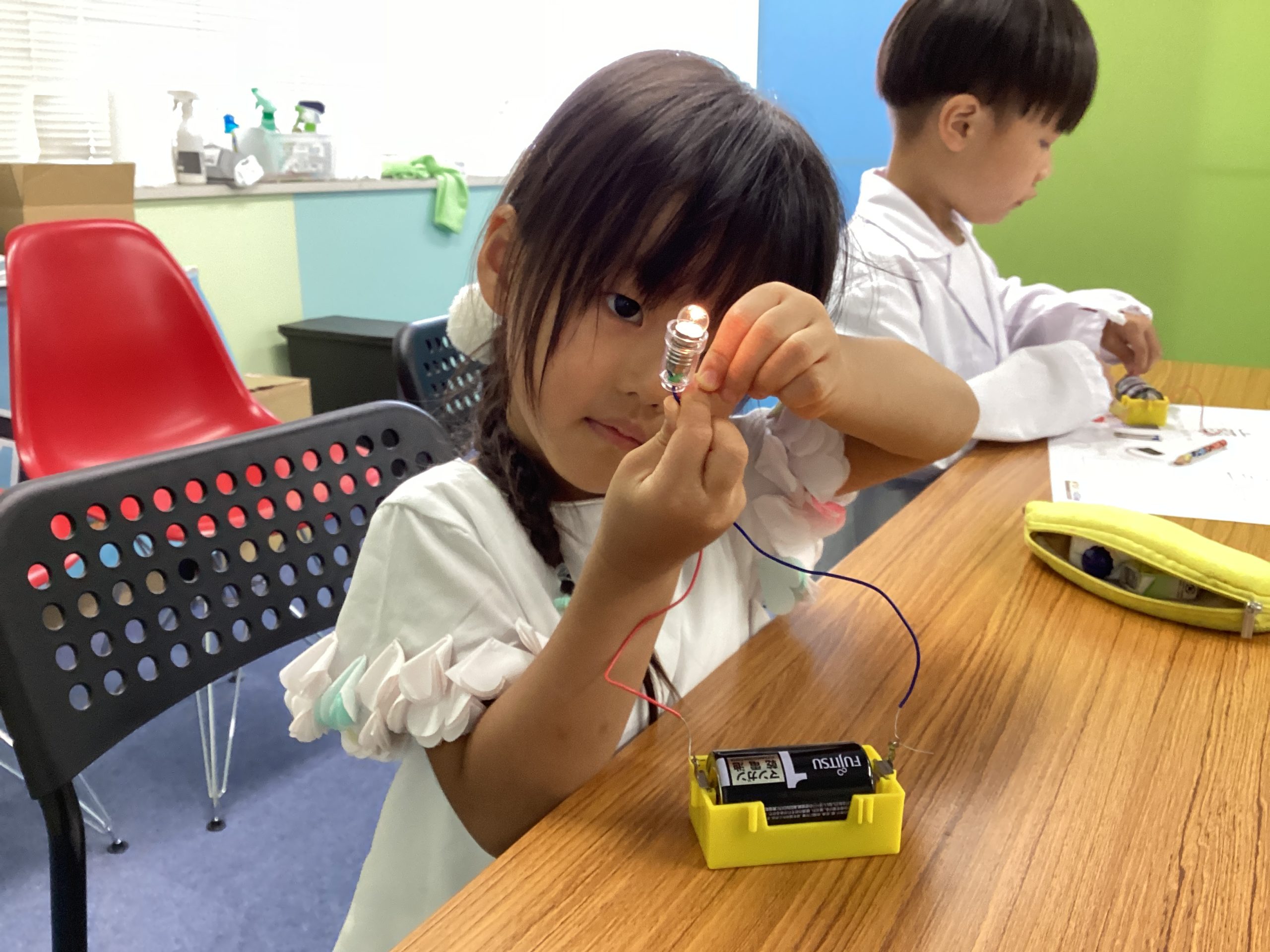 懐中電灯の分解の後、豆電球を光らせる実験も行いました。