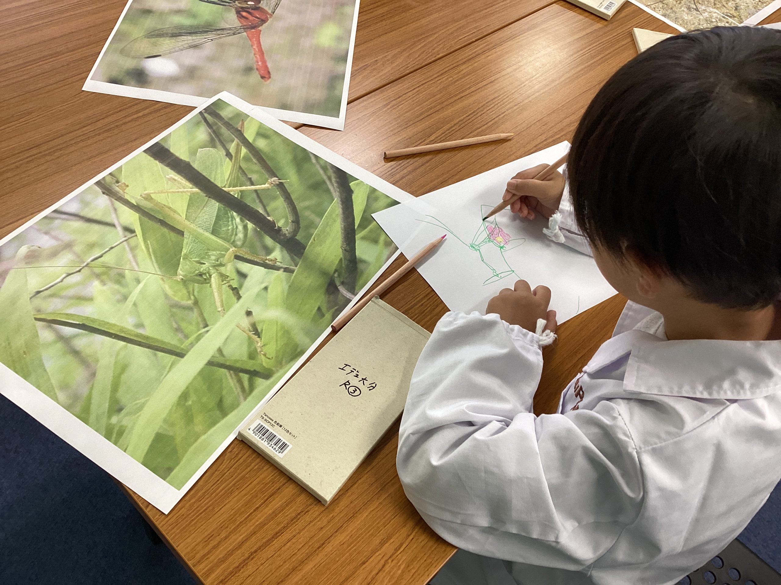 「赤とんぼ」「コオロギ」「スズムシ」「バッタ」の写真を見せると
