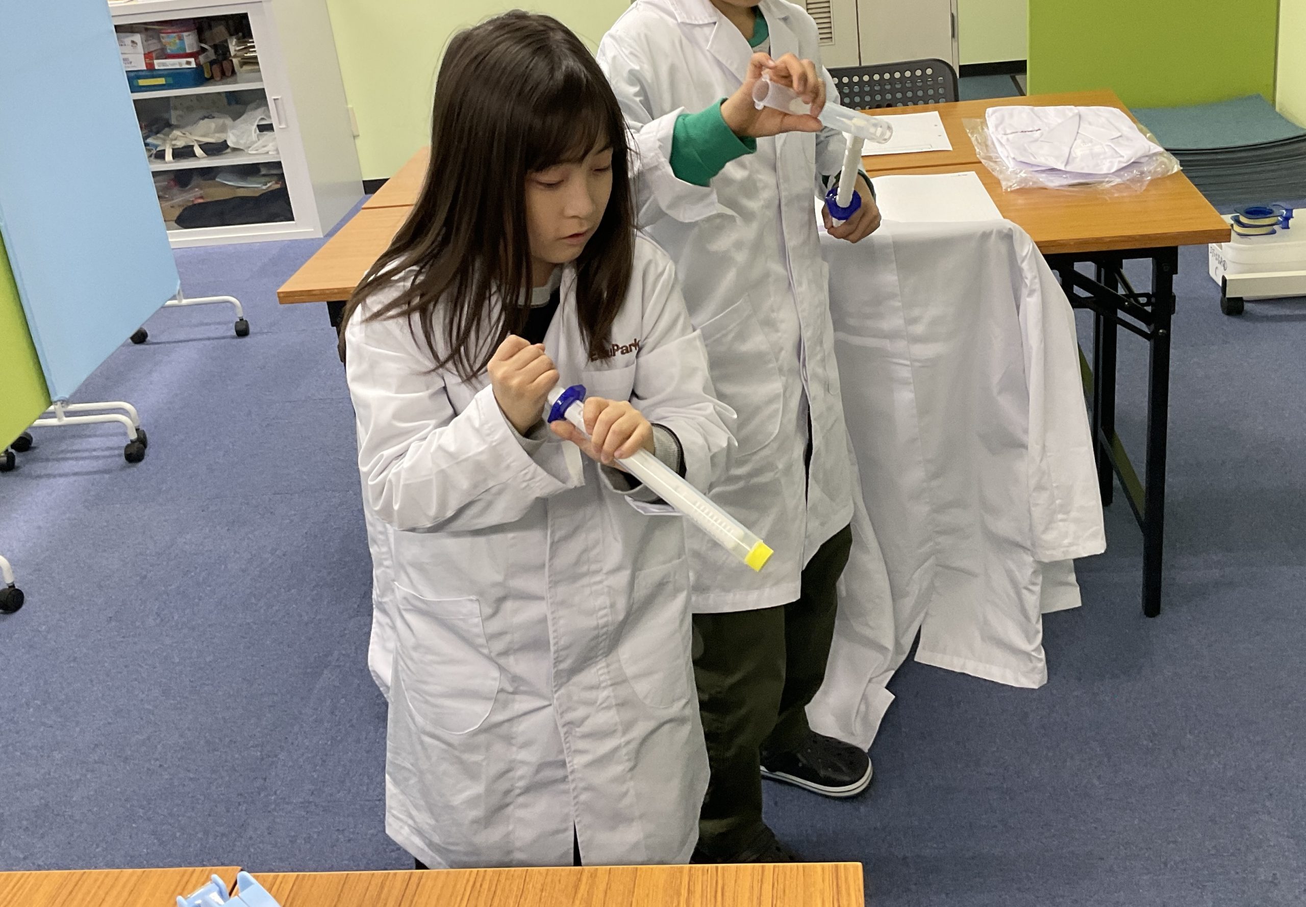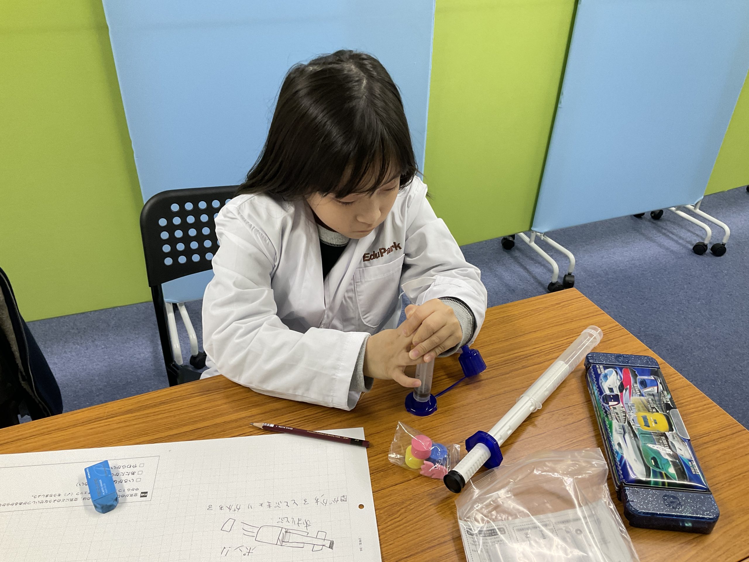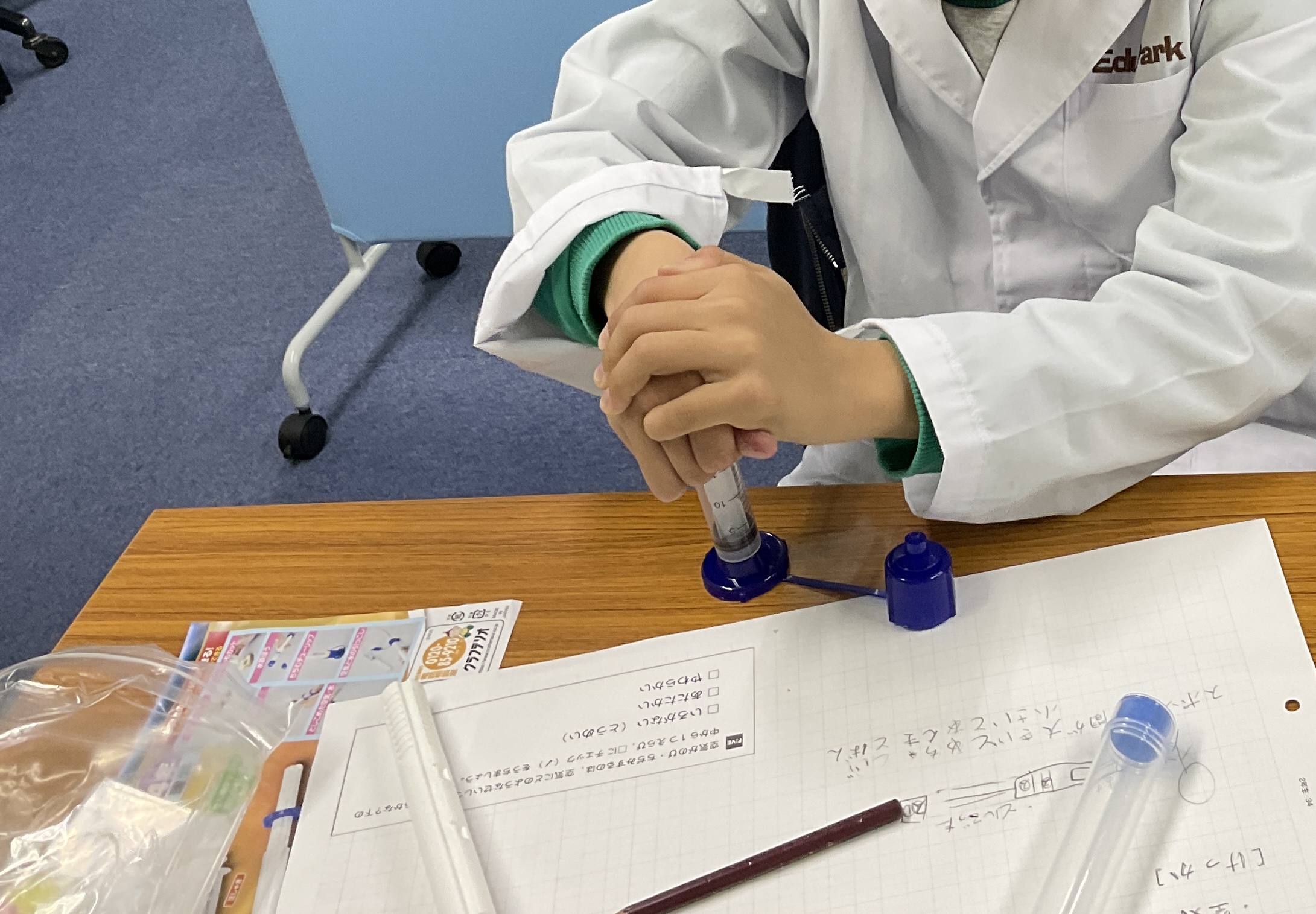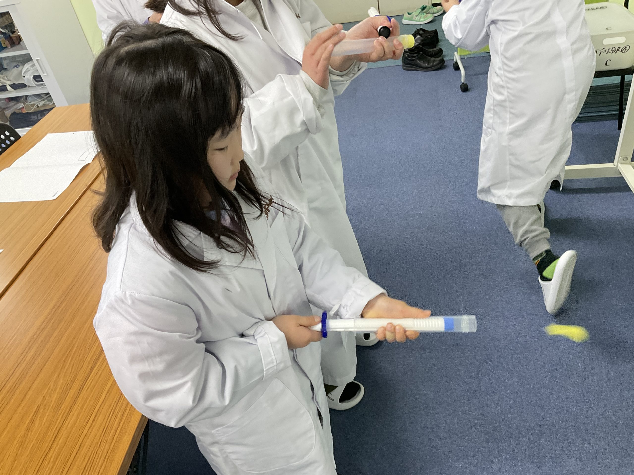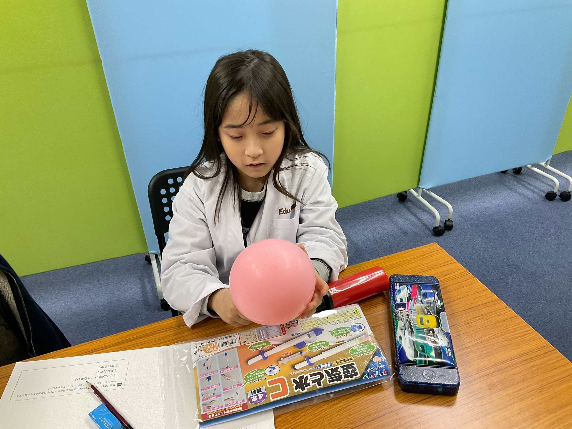 次に、実験キッドを使用し、空気を縮めるとどうなるかを確かめました💉