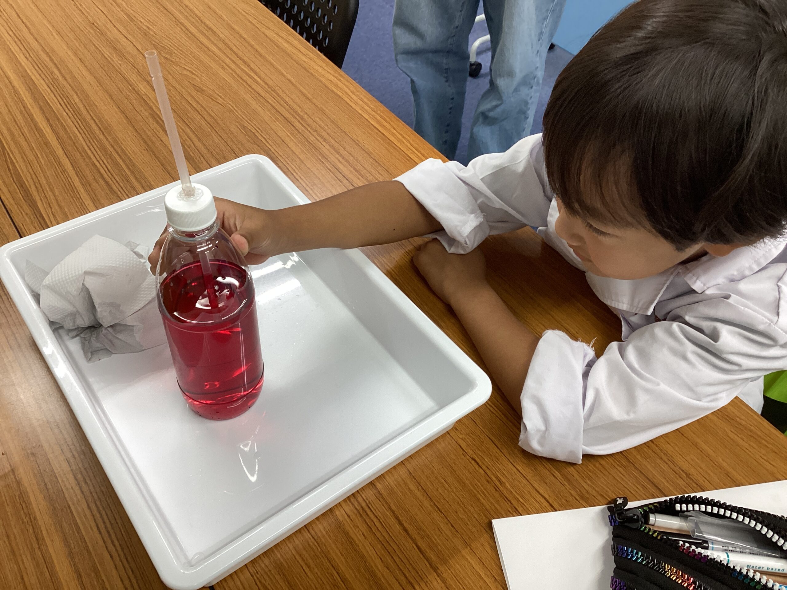 中の液体が温まると、ストロー内の赤い液体の水面が上昇していきます。