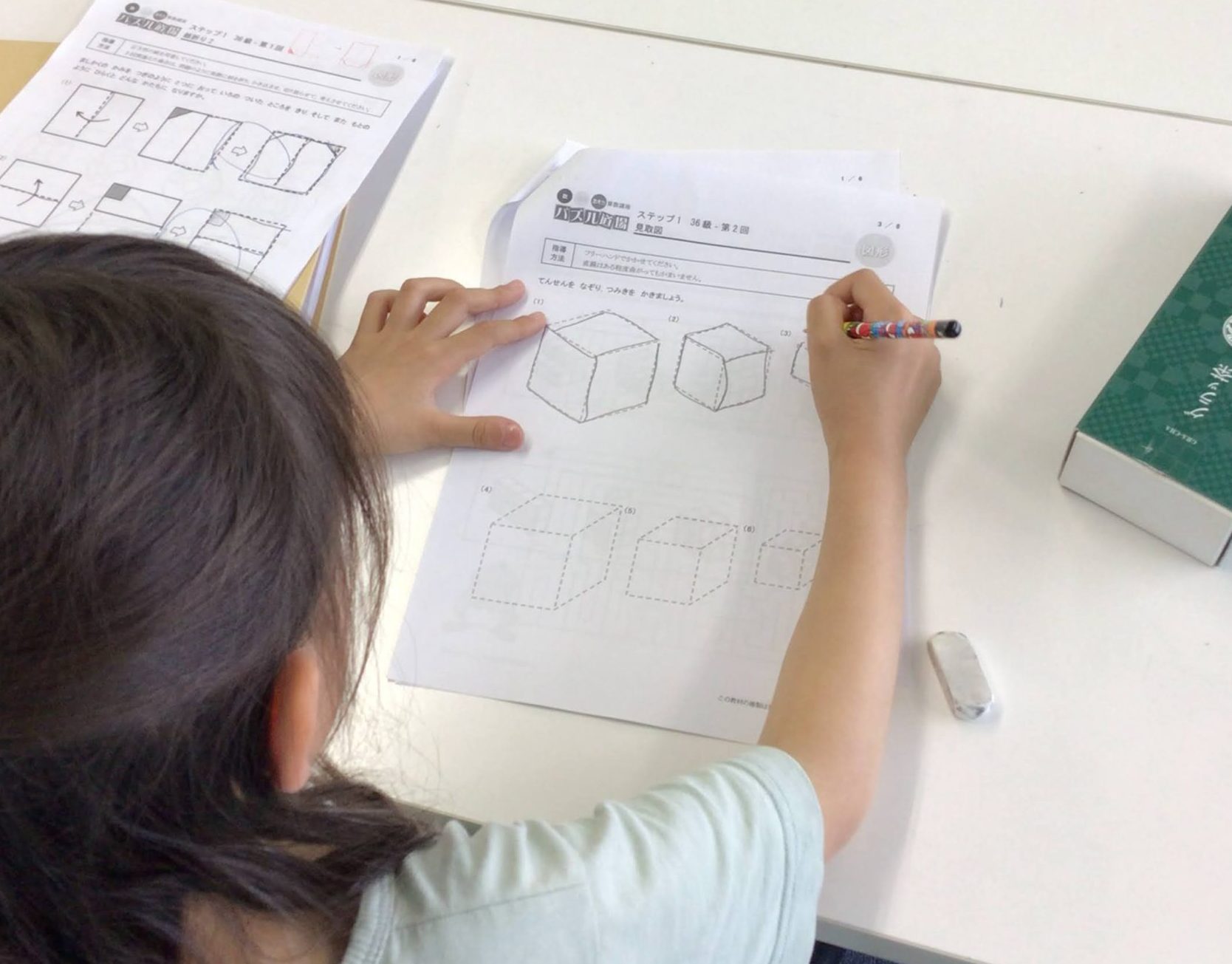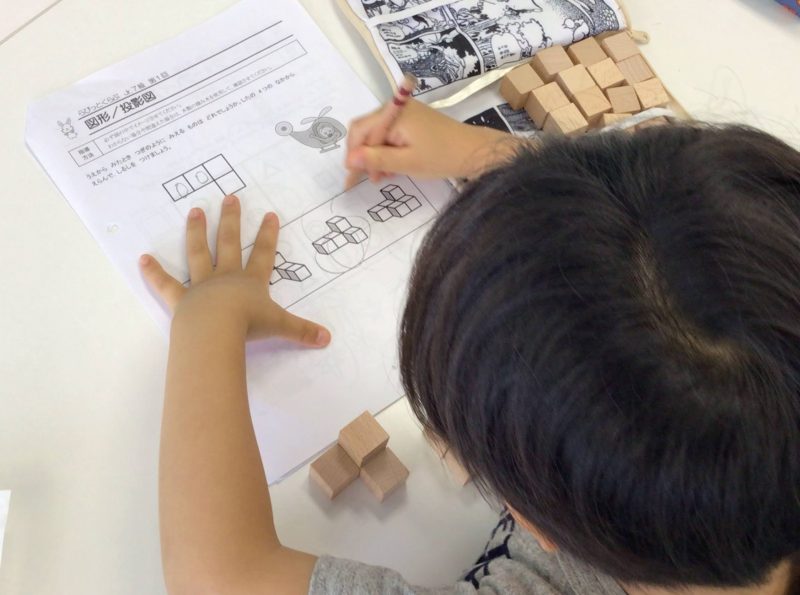 時には、実際に積み木を重ねて、自分の目でどうなっているかを確かめることもありますが、基本的にはプリント上で平面に描かれた図を見て考えます。