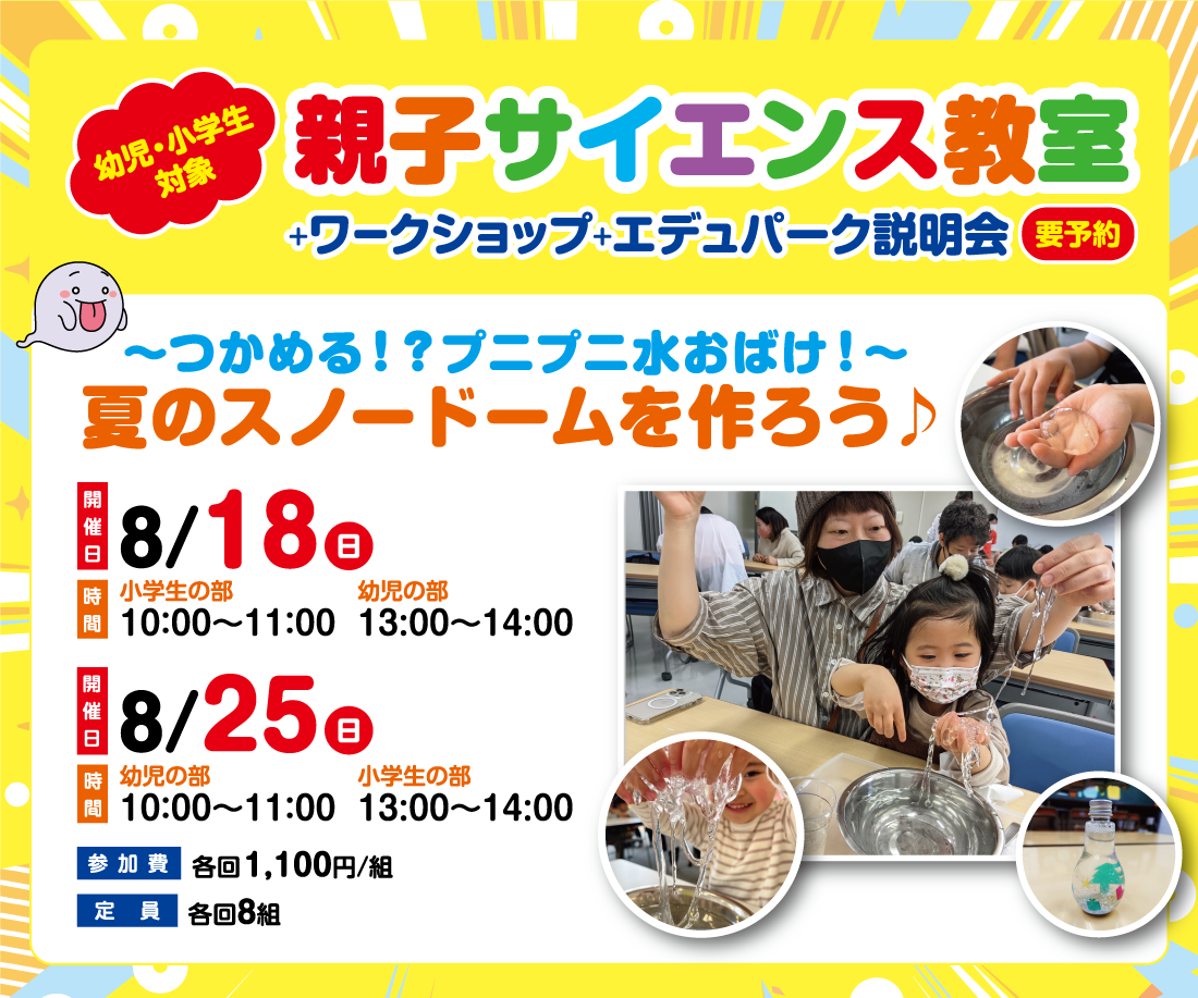 親子サイエンス教室+ワークショップ+エデュパーク説明会 2024.07.22 イベント PDFを見る ~つかめる!?プニプニ水おばけ!~ 夏のスノードームを作ろう♪ (幼児・小学生対象) 8月18日(日) 終了しました 小学生の部 10:00~11:00 幼児の部 13:00~14:00 8月25日(日) 終了しました 幼児の部 10:00~11:00 小学生の部 13:00~14:00 参加費:各回1,100円/組 定員:各回8組 参加申込はこちら 各回、満席になり次第、受付終了となります。 « 前の記事:2024夏休み限定!楽しさ満載のイベント! 次の記事:春の大学園祭2月22日・23日・24日 » 新着情報一覧へ戻る